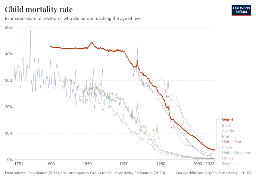 Gapminder (2015); UN Inter-agency Group for Child Mortality Estimation (2025) – processed by Our World in Data. “Child mortality rate – Gapminder; UN IGME – Long-run data” [dataset]. United Nations Inter-agency Group for Child Mortality Estimation, “United Nations Inter-agency Group for Child Mortality Estimation”; Gapminder, “Child mortality rate under age five v7”; Gapminder based on UN IGME & UN WPP, “Under-five Mortality v11”; Various sources, “Population” [original data]. Retrieved January 16, 2026 from https://archive.ourworldindata.org/20251023-195030/grapher/child-mortality.html (archived on October 23, 2025).