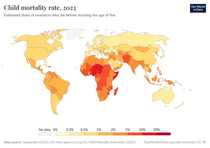 “Data Page: Child mortality rate”, part of the following publication: Saloni Dattani, Fiona Spooner, Hannah Ritchie, and Max Roser (2023) - “Child and Infant Mortality”. Data adapted from United Nations Inter-agency Group for Child Mortality Estimation, Gapminder, Gapminder based on UN IGME & UN WPP, Various sources. Retrieved from https://archive.ourworldindata.org/20251023-195030/grapher/child-mortality.html [online resource] (archived on October 23, 2025).
