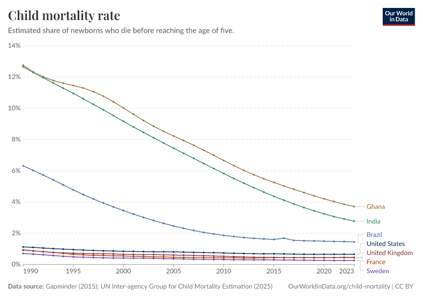 Gapminder (2015); UN Inter-agency Group for Child Mortality Estimation (2025) – processed by Our World in Data. “Child mortality rate – Gapminder; UN IGME – Long-run data” [dataset]. United Nations Inter-agency Group for Child Mortality Estimation, “United Nations Inter-agency Group for Child Mortality Estimation”; Gapminder, “Child mortality rate under age five v7”; Gapminder based on UN IGME & UN WPP, “Under-five Mortality v11”; Various sources, “Population” [original data]. Retrieved April 6, 2026 from https://archive.ourworldindata.org/20260402-173937/grapher/child-mortality.html (archived on April 2, 2026).Download