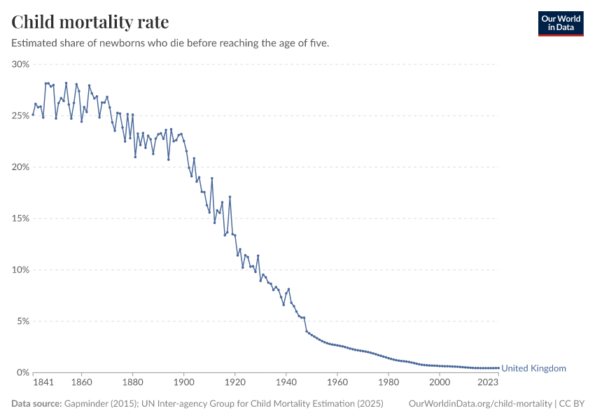 Gapminder (2015); UN Inter-agency Group for Child Mortality Estimation (2025) – processed by Our World in Data. “Child mortality rate – Gapminder; UN IGME – Long-run data” [dataset]. United Nations Inter-agency Group for Child Mortality Estimation, “United Nations Inter-agency Group for Child Mortality Estimation”; Gapminder, “Child mortality rate under age five v7”; Gapminder based on UN IGME & UN WPP, “Under-five Mortality v11”; Various sources, “Population” [original data]. Retrieved November 9, 2025 from https://archive.ourworldindata.org/20251023-195030/grapher/child-mortality.html (archived on October 23, 2025).