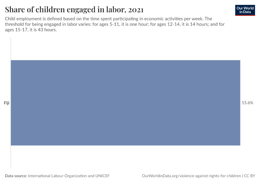 “Data Page: Share of children engaged in labor”. Our World in Data (2026). Data adapted from International Labour Organization and UNICEF. Retrieved from https://archive.ourworldindata.org/20251125-165536/grapher/children-aged-5-17-engaged-in-labor.html [online resource] (archived on November 25, 2025).