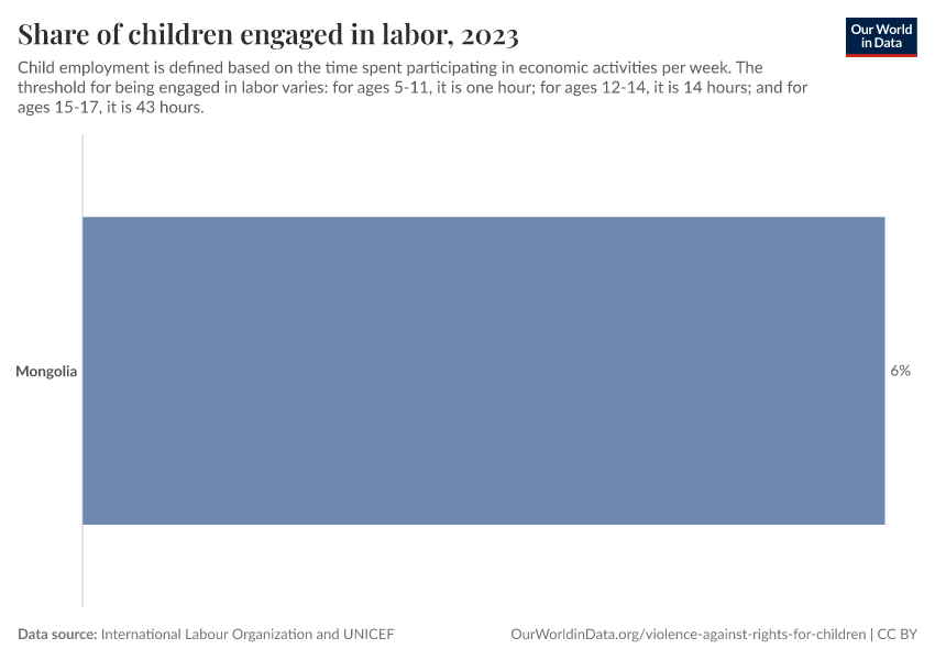 “Data Page: Share of children engaged in labor”. Our World in Data (2026). Data adapted from International Labour Organization and UNICEF. Retrieved from https://archive.ourworldindata.org/20251125-165536/grapher/children-aged-5-17-engaged-in-labor.html [online resource] (archived on November 25, 2025).How to cite this data