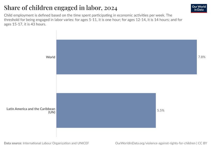 “Data Page: Share of children engaged in labor”. Our World in Data (2026). Data adapted from International Labour Organization and UNICEF. Retrieved from https://archive.ourworldindata.org/20251125-165536/grapher/children-aged-5-17-engaged-in-labor.html [online resource] (archived on November 25, 2025).How to cite this data