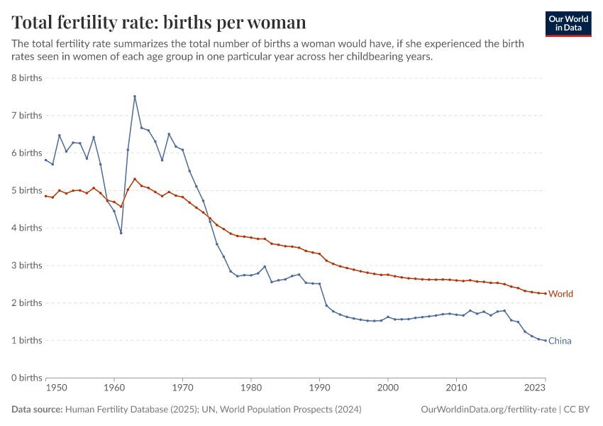 Human Fertility Database (2025); UN, World Population Prospects (2024) – with major processing by Our World in Data. “Fertility rate: births per woman – HFD, UN WPP – period tables” [dataset]. Human Fertility Database, “Human Fertility Database”; United Nations, “World Population Prospects”; United Nations, “World Population Prospects - Interim Update” [original data]. Retrieved April 5, 2026 from https://archive.ourworldindata.org/20260402-163007/grapher/children-born-per-woman.html (archived on April 2, 2026).
