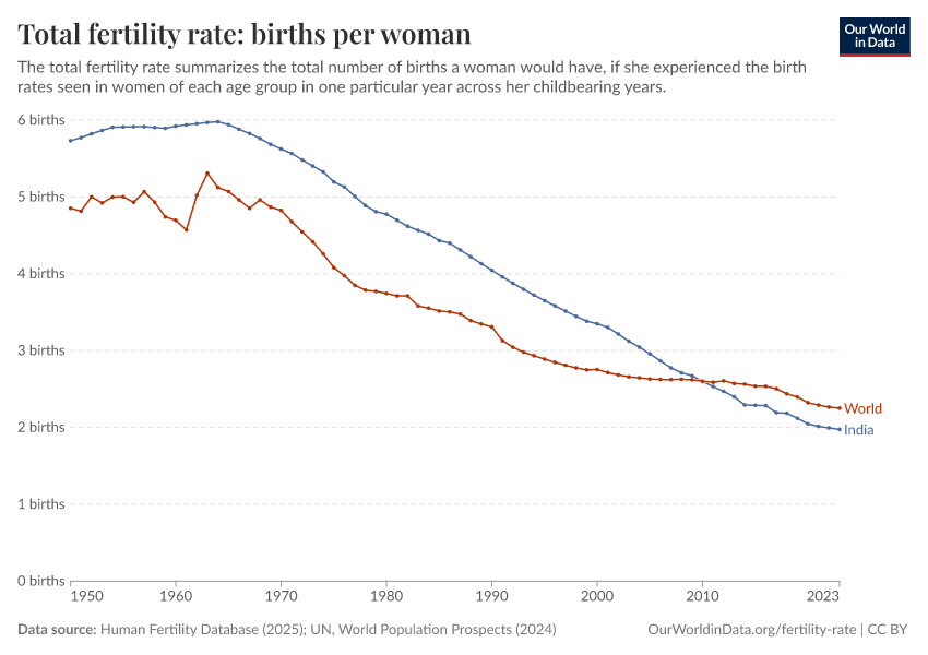 Human Fertility Database (2025); UN, World Population Prospects (2024) – with major processing by Our World in Data. “Fertility rate: births per woman – HFD, UN WPP – period tables” [dataset]. Human Fertility Database, “Human Fertility Database”; United Nations, “World Population Prospects” [original data]. Retrieved March 26, 2026 from https://archive.ourworldindata.org/20260304-094028/grapher/children-born-per-woman.html (archived on March 4, 2026).