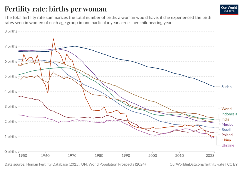 Human Fertility Database (2025); UN, World Population Prospects (2024) – with major processing by Our World in Data. “Fertility rate: births per woman – HFD, UN WPP – period tables” [dataset]. Human Fertility Database, “Human Fertility Database”; United Nations, “World Population Prospects”; United Nations, “World Population Prospects - Interim Update” [original data]. Retrieved April 11, 2026 from https://archive.ourworldindata.org/20260410-110733/grapher/children-born-per-woman.html (archived on April 10, 2026).Download