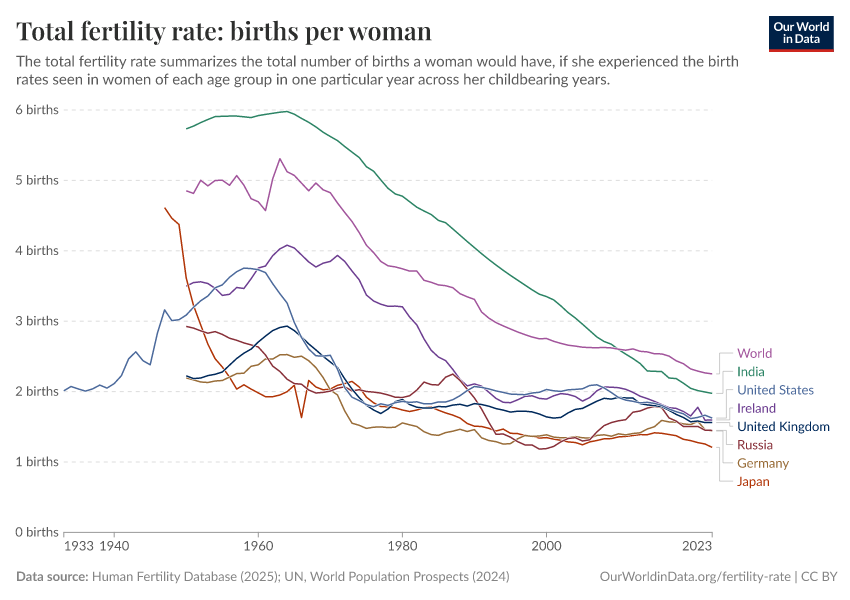 Human Fertility Database (2025); UN, World Population Prospects (2024) – with major processing by Our World in Data. “Fertility rate: births per woman – HFD, UN WPP – period tables” [dataset]. Human Fertility Database, “Human Fertility Database”; United Nations, “World Population Prospects” [original data]. Retrieved December 14, 2025 from https://archive.ourworldindata.org/20251022-230420/grapher/children-born-per-woman.html (archived on October 22, 2025).