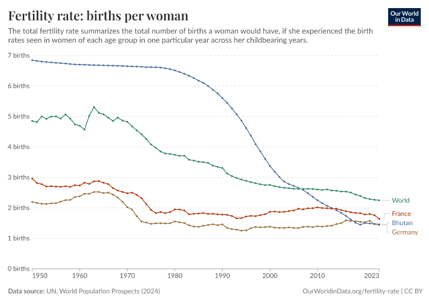 “Data Page: Fertility rate, total”. Our World in Data (2026). Data adapted from United Nations. Retrieved from https://archive.ourworldindata.org/20250909-093708/grapher/children-per-woman-un.html [online resource] (archived on September 9, 2025).How to cite this data
