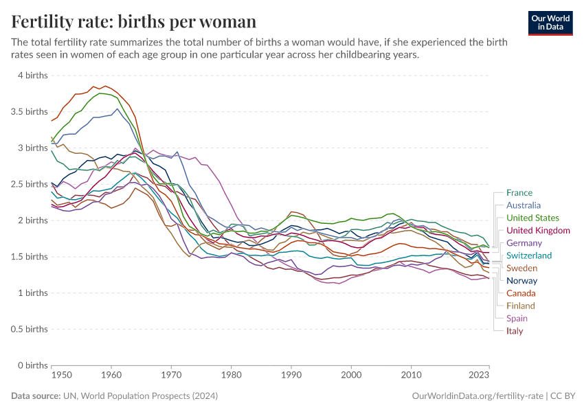 “Data Page: Fertility rate, total”. Our World in Data (2025). Data adapted from United Nations. Retrieved from https://archive.ourworldindata.org/20250909-093708/grapher/children-per-woman-un.html [online resource] (archived on September 9, 2025).How to cite this data