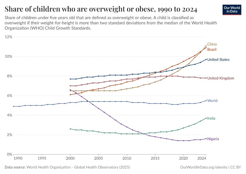 World Health Organization - Global Health Observatory (2025) – processed by Our World in Data. “Share of children who are overweight or obese” [dataset]. World Health Organization, “Global Health Observatory” [original data]. Retrieved December 12, 2025 from https://archive.ourworldindata.org/20250909-093708/grapher/children-who-are-overweight-sdgs.html (archived on September 9, 2025).