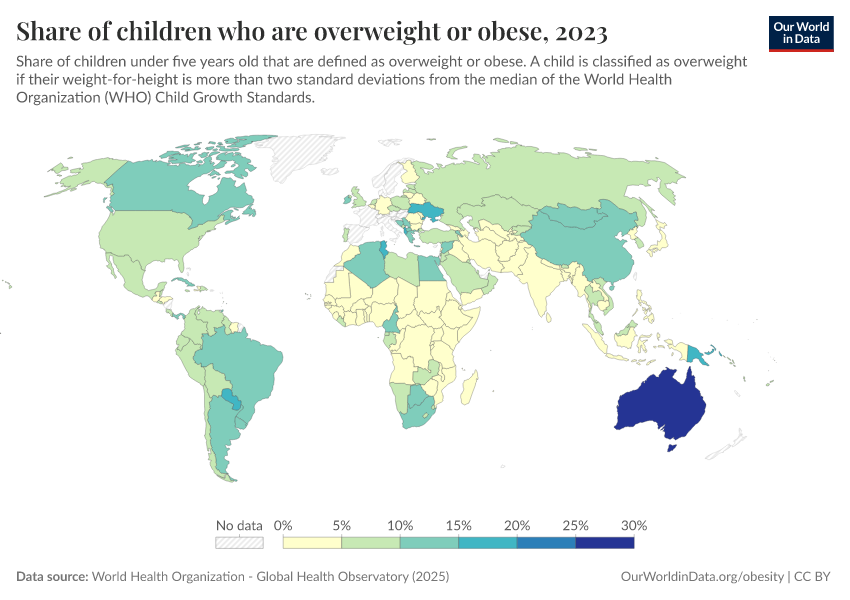 “Data Page: Share of children who are overweight or obese”. Our World in Data (2026). Data adapted from World Health Organization. Retrieved from https://archive.ourworldindata.org/20260304-094028/grapher/children-who-are-overweight-sdgs.html [online resource] (archived on March 4, 2026).How to cite this data
