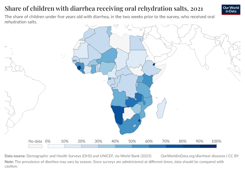 “Data Page: Share of children with diarrhea receiving oral rehydration salts”. Our World in Data (2026). Data adapted from Demographic and Health Surveys (DHS) and UNICEF, via World Bank. Retrieved from https://archive.ourworldindata.org/20260112-111535/grapher/children-who-receive-ors.html [online resource] (archived on January 12, 2026).How to cite this data