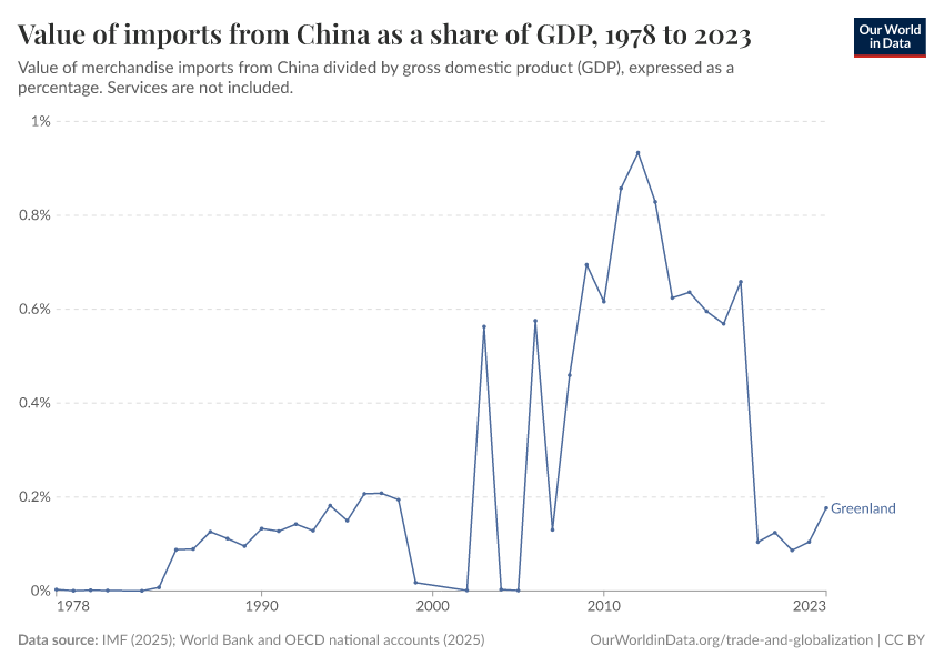 “Data Page: Value of imports from China as a share of GDP”, part of the following publication: Esteban Ortiz-Ospina, Diana Beltekian, and Max Roser (2018) - “Trade and Globalization”. Data adapted from International Monetary Fund, World Bank and OECD national accounts. Retrieved from https://archive.ourworldindata.org/20251119-181733/grapher/china-imports-as-share-of-gdp.html [online resource] (archived on November 19, 2025).
