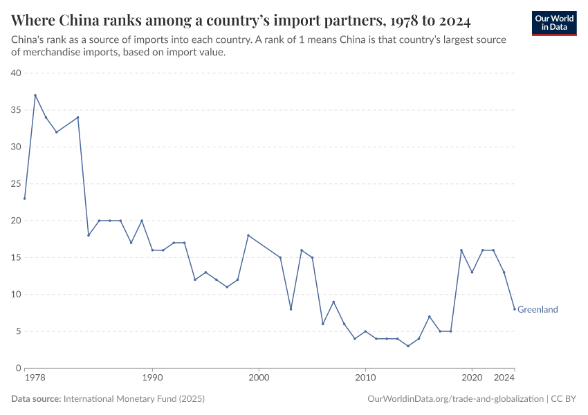 International Monetary Fund (2025) – with major processing by Our World in Data. “Where China ranks among a country’s import partners” [dataset]. International Monetary Fund, “International Trade in Goods (by partner country) (IMTS)” [original data]. Retrieved December 5, 2025 from https://archive.ourworldindata.org/20251128-145023/grapher/chinas-rank-in-imports-of-goods.html (archived on November 28, 2025).