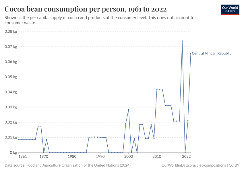 “Data Page: Yearly per capita supply of cocoa beans”. Our World in Data (2025). Data adapted from Food and Agriculture Organization of the United Nations. Retrieved from https://archive.ourworldindata.org/20251128-120039/grapher/chocolate-consumption-per-person.html [online resource] (archived on November 28, 2025).How to cite this data