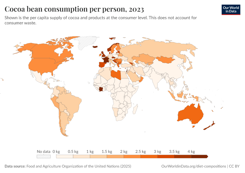 “Data Page: Yearly per capita supply of cocoa beans”. Our World in Data (2026). Data adapted from Food and Agriculture Organization of the United Nations. Retrieved from https://archive.ourworldindata.org/20260410-215714/grapher/chocolate-consumption-per-person.html [online resource] (archived on April 10, 2026).How to cite this data
