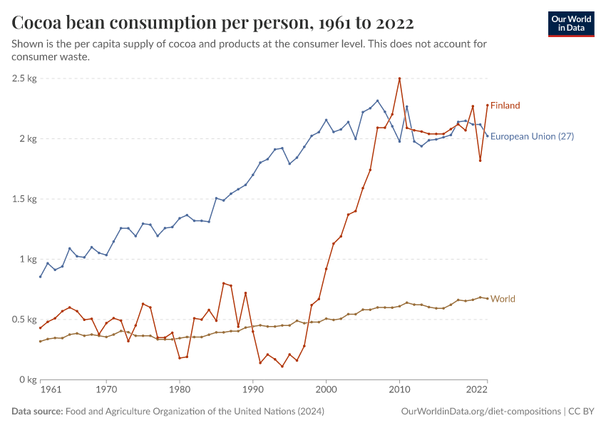 Food and Agriculture Organization of the United Nations (2024) – processed by Our World in Data. “Yearly per capita supply of cocoa beans” [dataset]. Food and Agriculture Organization of the United Nations, “Food Balances: Food Balances (-2013, old methodology and population)”; Food and Agriculture Organization of the United Nations, “Food Balances: Food Balances (2010-)” [original data]. Retrieved January 9, 2026 from https://archive.ourworldindata.org/20251128-120039/grapher/chocolate-consumption-per-person.html (archived on November 28, 2025).