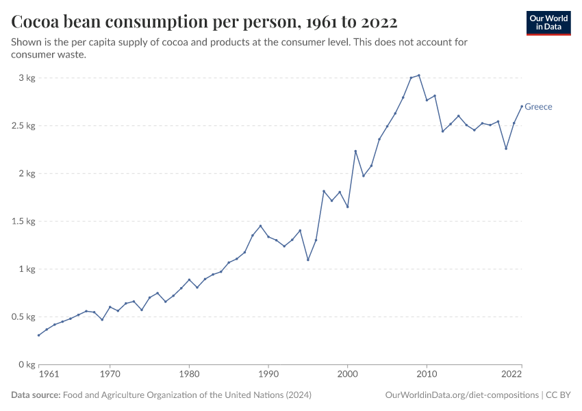 “Data Page: Yearly per capita supply of cocoa beans”. Our World in Data (2025). Data adapted from Food and Agriculture Organization of the United Nations. Retrieved from https://archive.ourworldindata.org/20251128-120039/grapher/chocolate-consumption-per-person.html [online resource] (archived on November 28, 2025).How to cite this data