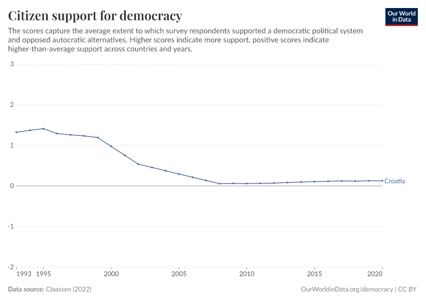 • Higher scores indicate more support. Positive scores mean that citizen support for democracy is higher than the average across all countries and years. A score of 1 means that citizen support lies one standard deviation above the average support.