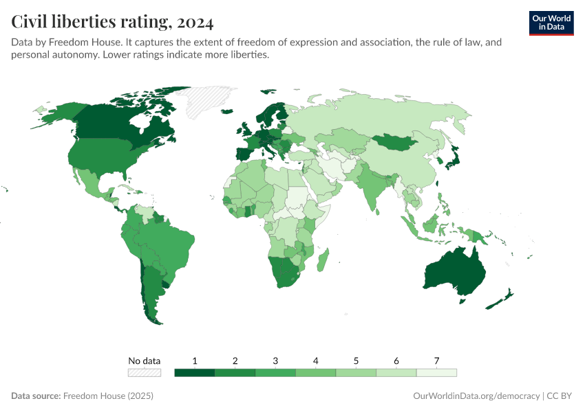 Freedom House (2025) – processed by Our World in Data. “Civil liberties rating” [dataset]. Freedom House, “Freedom in the World” [original data]. Retrieved December 6, 2025 from https://archive.ourworldindata.org/20250909-093708/grapher/civil-liberties-rating-fh.html (archived on September 9, 2025).