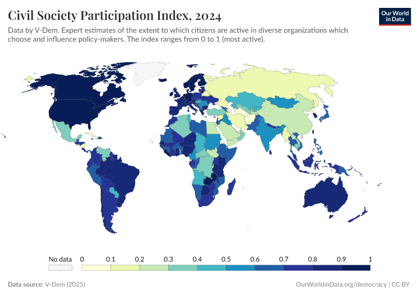 “Data Page: Civil society participation index”, part of the following publication: Bastian Herre, Lucas Rodés-Guirao, and Esteban Ortiz-Ospina (2013) - “Democracy”. Data adapted from V-Dem. Retrieved from https://archive.ourworldindata.org/20251209-133038/grapher/civil-society-participation-index.html [online resource] (archived on December 9, 2025).How to cite this data