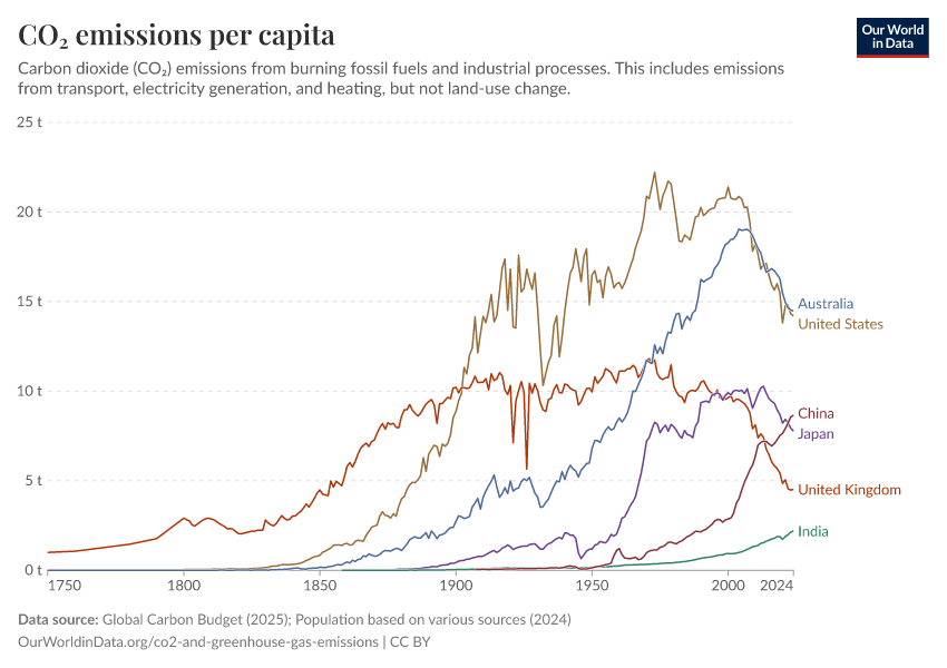 “Data Page: CO₂ emissions per capita”, part of the following publication: Hannah Ritchie, Pablo Rosado, and Max Roser (2023) - “CO₂ and Greenhouse Gas Emissions”. Data adapted from Global Carbon Project, Various sources. Retrieved from https://archive.ourworldindata.org/20251204-133459/grapher/co-emissions-per-capita.html [online resource] (archived on December 4, 2025).