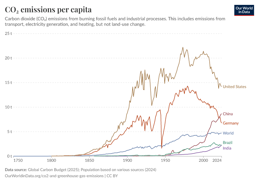 “Data Page: CO₂ emissions per capita”, part of the following publication: Hannah Ritchie, Pablo Rosado, and Max Roser (2023) - “CO₂ and Greenhouse Gas Emissions”. Data adapted from Global Carbon Project, Various sources. Retrieved from https://archive.ourworldindata.org/20260402-173937/grapher/co-emissions-per-capita.html [online resource] (archived on April 2, 2026).