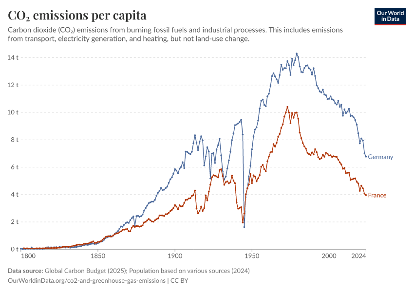 “Data Page: CO₂ emissions per capita”, part of the following publication: Hannah Ritchie, Pablo Rosado, and Max Roser (2023) - “CO₂ and Greenhouse Gas Emissions”. Data adapted from Global Carbon Project, Various sources. Retrieved from https://archive.ourworldindata.org/20260119-070102/grapher/co-emissions-per-capita.html [online resource] (archived on January 19, 2026).How to cite this data
