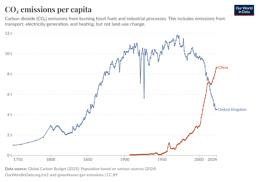 “Data Page: CO₂ emissions per capita”, part of the following publication: Hannah Ritchie, Pablo Rosado, and Max Roser (2023) - “CO₂ and Greenhouse Gas Emissions”. Data adapted from Global Carbon Project, Various sources. Retrieved from https://archive.ourworldindata.org/20260119-070102/grapher/co-emissions-per-capita.html [online resource] (archived on January 19, 2026).How to cite this data