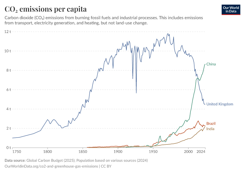 “Data Page: CO₂ emissions per capita”, part of the following publication: Hannah Ritchie, Pablo Rosado, and Max Roser (2023) - “CO₂ and Greenhouse Gas Emissions”. Data adapted from Global Carbon Project, Various sources. Retrieved from https://archive.ourworldindata.org/20251204-133459/grapher/co-emissions-per-capita.html [online resource] (archived on December 4, 2025).How to cite this data