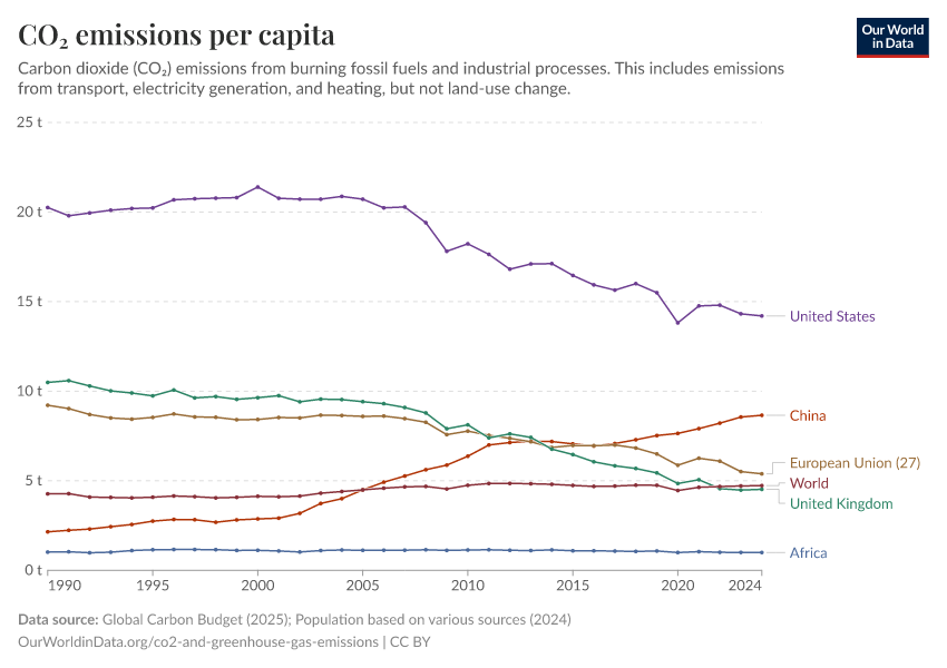 “Data Page: CO₂ emissions per capita”, part of the following publication: Hannah Ritchie, Pablo Rosado, and Max Roser (2023) - “CO₂ and Greenhouse Gas Emissions”. Data adapted from Global Carbon Project, Various sources. Retrieved from https://archive.ourworldindata.org/20251204-133459/grapher/co-emissions-per-capita.html [online resource] (archived on December 4, 2025).