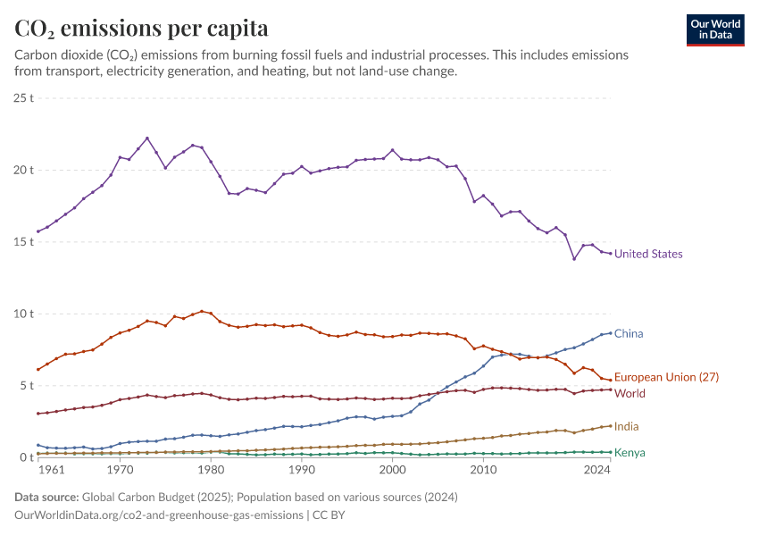 “Data Page: CO₂ emissions per capita”, part of the following publication: Hannah Ritchie, Pablo Rosado, and Max Roser (2023) - “CO₂ and Greenhouse Gas Emissions”. Data adapted from Global Carbon Project, Various sources. Retrieved from https://archive.ourworldindata.org/20260119-070102/grapher/co-emissions-per-capita.html [online resource] (archived on January 19, 2026).How to cite this data