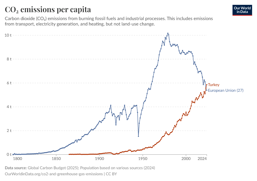 “Data Page: CO₂ emissions per capita”, part of the following publication: Hannah Ritchie, Pablo Rosado, and Max Roser (2023) - “CO₂ and Greenhouse Gas Emissions”. Data adapted from Global Carbon Project, Various sources. Retrieved from https://archive.ourworldindata.org/20251204-133459/grapher/co-emissions-per-capita.html [online resource] (archived on December 4, 2025).How to cite this data