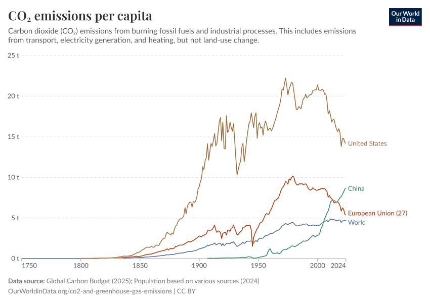“Data Page: CO₂ emissions per capita”, part of the following publication: Hannah Ritchie, Pablo Rosado, and Max Roser (2023) - “CO₂ and Greenhouse Gas Emissions”. Data adapted from Global Carbon Project, Various sources. Retrieved from https://archive.ourworldindata.org/20260119-070102/grapher/co-emissions-per-capita.html [online resource] (archived on January 19, 2026).How to cite this data