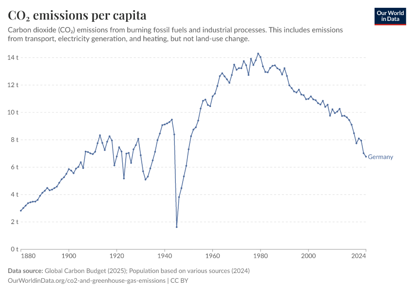 “Data Page: CO₂ emissions per capita”, part of the following publication: Hannah Ritchie, Pablo Rosado, and Max Roser (2023) - “CO₂ and Greenhouse Gas Emissions”. Data adapted from Global Carbon Project, Various sources. Retrieved from https://archive.ourworldindata.org/20251204-133459/grapher/co-emissions-per-capita.html [online resource] (archived on December 4, 2025).How to cite this data