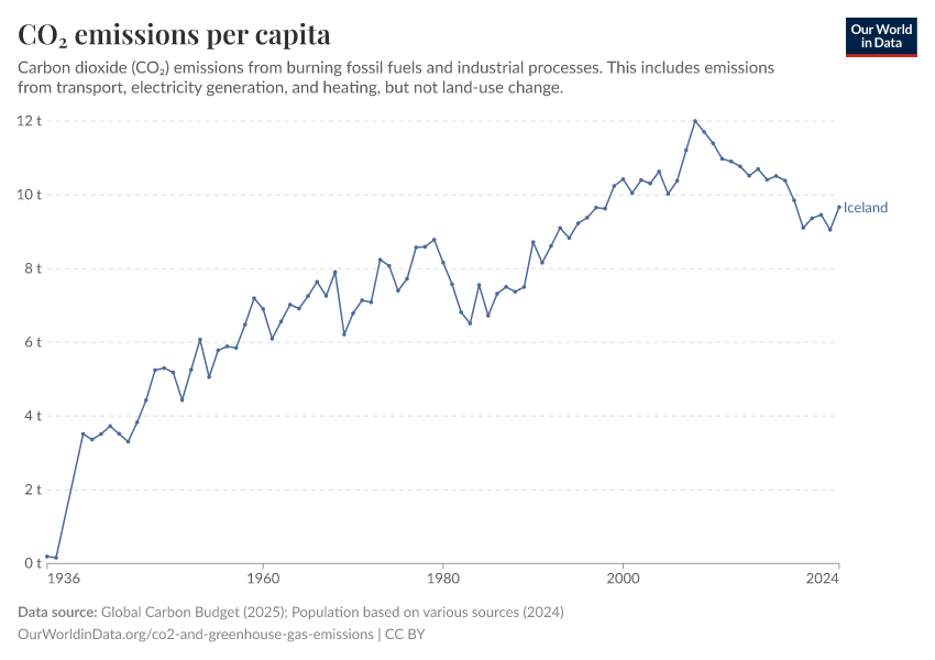 “Data Page: CO₂ emissions per capita”, part of the following publication: Hannah Ritchie, Pablo Rosado, and Max Roser (2023) - “CO₂ and Greenhouse Gas Emissions”. Data adapted from Global Carbon Project, Various sources. Retrieved from https://archive.ourworldindata.org/20251204-133459/grapher/co-emissions-per-capita.html [online resource] (archived on December 4, 2025).How to cite this data