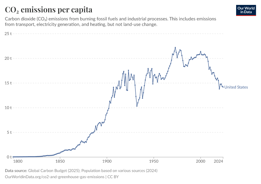 “Data Page: CO₂ emissions per capita”, part of the following publication: Hannah Ritchie, Pablo Rosado, and Max Roser (2023) - “CO₂ and Greenhouse Gas Emissions”. Data adapted from Global Carbon Project, Various sources. Retrieved from https://archive.ourworldindata.org/20251113-170236/grapher/co-emissions-per-capita.html [online resource] (archived on November 13, 2025).How to cite this data