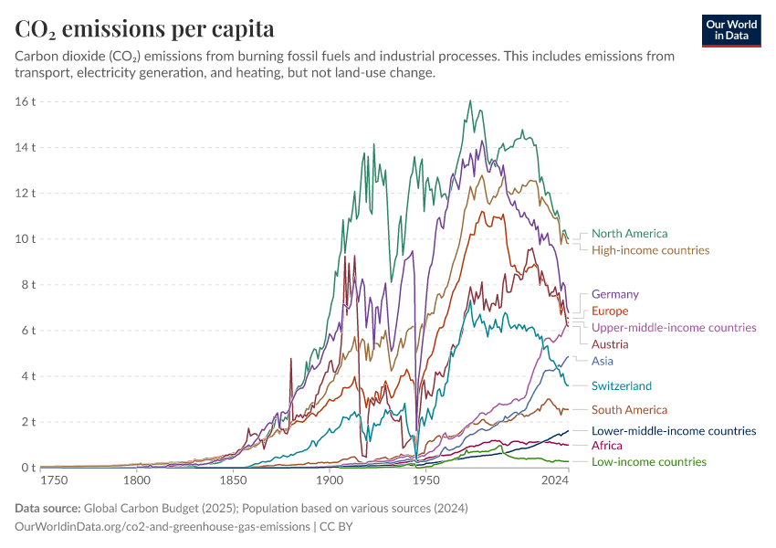 “Data Page: CO₂ emissions per capita”, part of the following publication: Hannah Ritchie, Pablo Rosado, and Max Roser (2023) - “CO₂ and Greenhouse Gas Emissions”. Data adapted from Global Carbon Project, Various sources. Retrieved from https://archive.ourworldindata.org/20260119-070102/grapher/co-emissions-per-capita.html [online resource] (archived on January 19, 2026).How to cite this data
