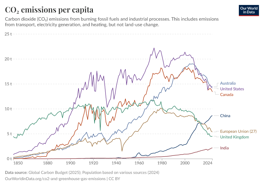 “Data Page: CO₂ emissions per capita”, part of the following publication: Hannah Ritchie, Pablo Rosado, and Max Roser (2023) - “CO₂ and Greenhouse Gas Emissions”. Data adapted from Global Carbon Project, Various sources. Retrieved from https://archive.ourworldindata.org/20251113-170236/grapher/co-emissions-per-capita.html [online resource] (archived on November 13, 2025).How to cite this data