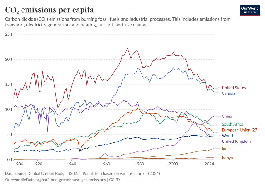 “Data Page: CO₂ emissions per capita”, part of the following publication: Hannah Ritchie, Pablo Rosado, and Max Roser (2023) - “CO₂ and Greenhouse Gas Emissions”. Data adapted from Global Carbon Project, Various sources. Retrieved from https://archive.ourworldindata.org/20260304-094028/grapher/co-emissions-per-capita.html [online resource] (archived on March 4, 2026).