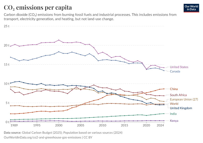 “Data Page: CO₂ emissions per capita”, part of the following publication: Hannah Ritchie, Pablo Rosado, and Max Roser (2023) - “CO₂ and Greenhouse Gas Emissions”. Data adapted from Global Carbon Project, Various sources. Retrieved from https://archive.ourworldindata.org/20260417-112857/grapher/co-emissions-per-capita.html [online resource] (archived on April 17, 2026).How to cite this data