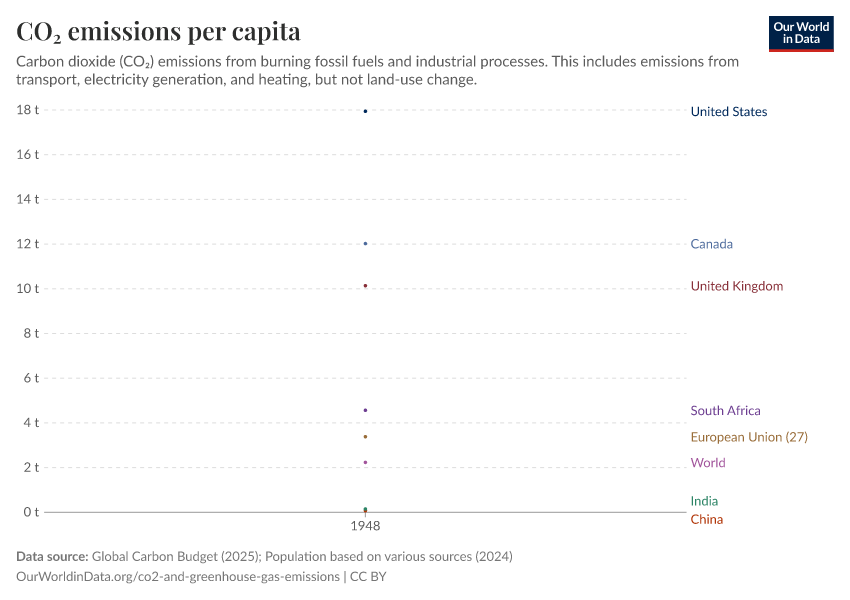 “Data Page: CO₂ emissions per capita”, part of the following publication: Hannah Ritchie, Pablo Rosado, and Max Roser (2023) - “CO₂ and Greenhouse Gas Emissions”. Data adapted from Global Carbon Project, Various sources. Retrieved from https://archive.ourworldindata.org/20260304-094028/grapher/co-emissions-per-capita.html [online resource] (archived on March 4, 2026).How to cite this data