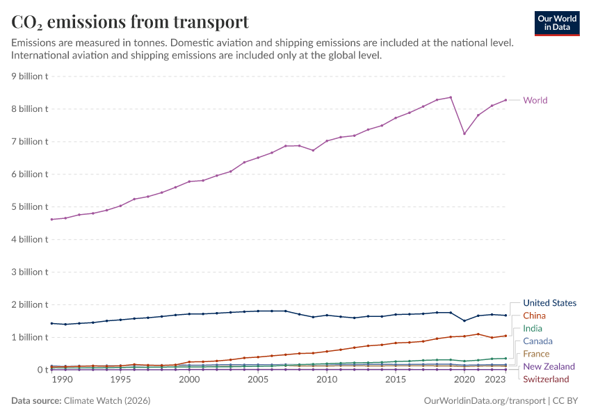 Climate Watch (2026) – with major processing by Our World in Data. “CO₂ emissions from transport” [dataset]. Climate Watch, “Greenhouse gas emissions by sector” [original data]. Retrieved March 2, 2026 from https://archive.ourworldindata.org/20260210-185618/grapher/co2-emissions-transport.html (archived on February 10, 2026).