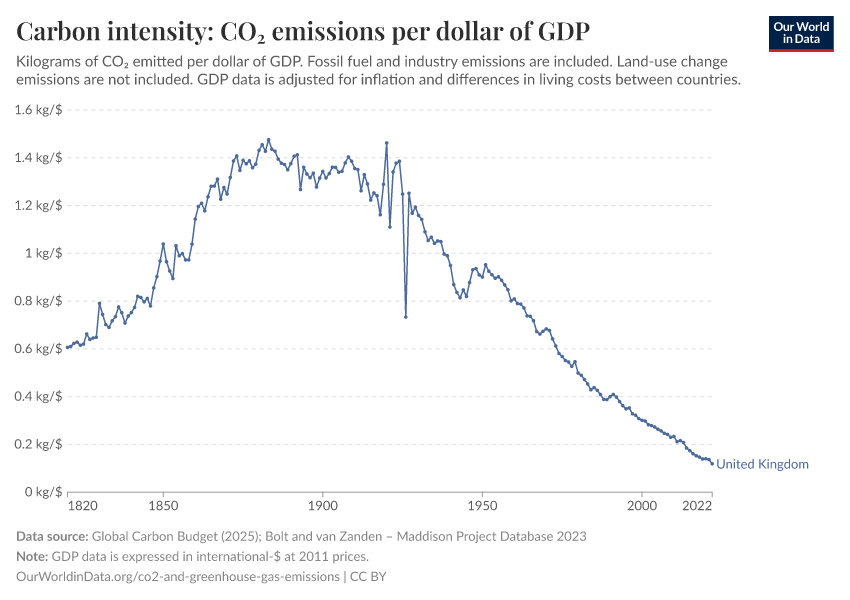 “Data Page: Carbon intensity: CO₂ emissions per dollar of GDP”, part of the following publication: Hannah Ritchie, Pablo Rosado, and Max Roser (2023) - “CO₂ and Greenhouse Gas Emissions”. Data adapted from Global Carbon Project, Bolt and van Zanden. Retrieved from https://archive.ourworldindata.org/20251204-133459/grapher/co2-intensity.html [online resource] (archived on December 4, 2025).