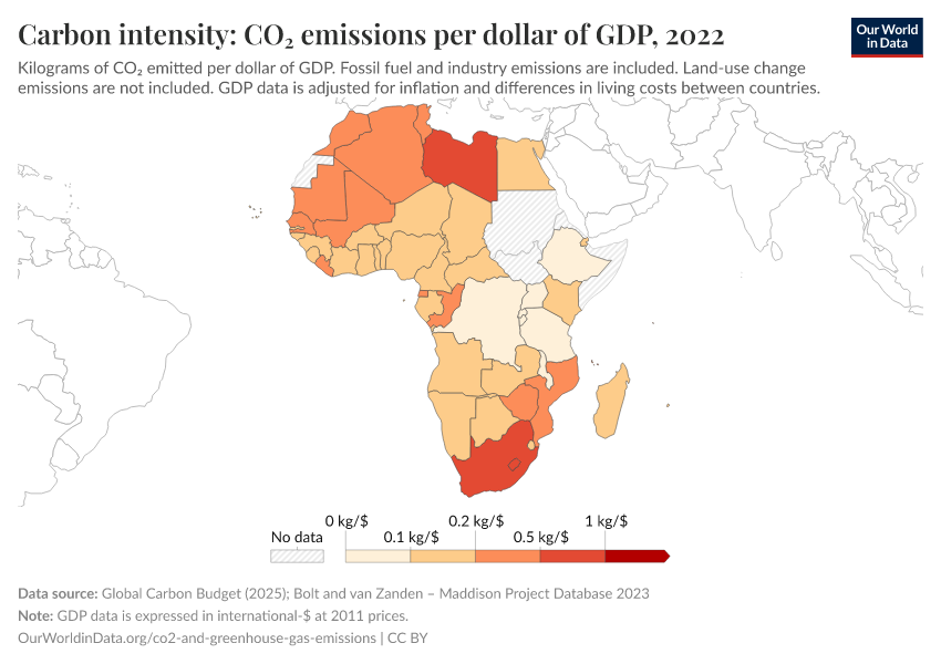 “Data Page: Carbon intensity: CO₂ emissions per dollar of GDP”, part of the following publication: Hannah Ritchie, Pablo Rosado, and Max Roser (2023) - “CO₂ and Greenhouse Gas Emissions”. Data adapted from Global Carbon Project, Bolt and van Zanden. Retrieved from https://archive.ourworldindata.org/20251111-144738/grapher/co2-intensity.html [online resource] (archived on November 11, 2025).How to cite this data