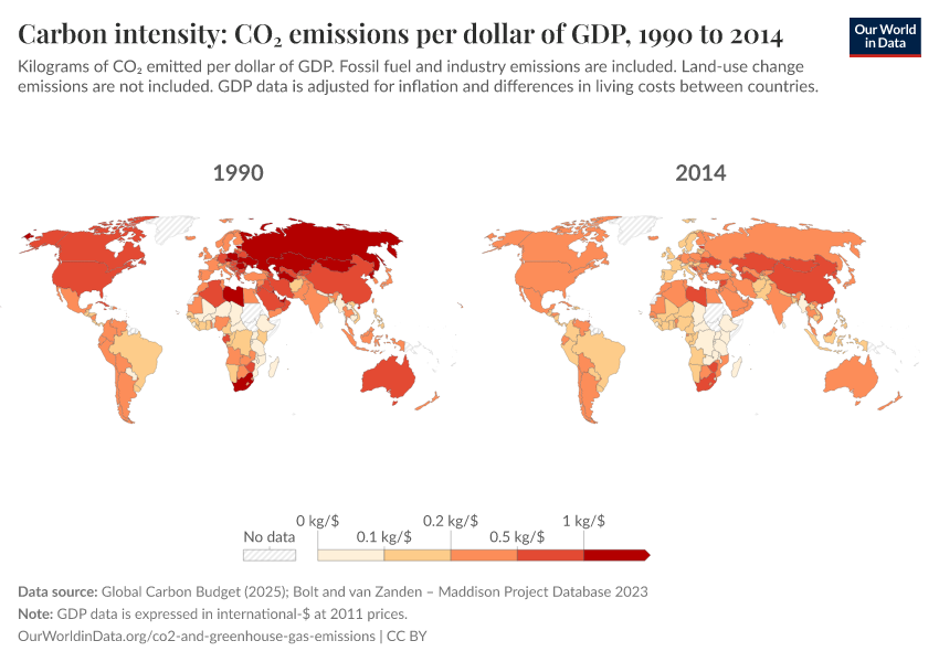 “Data Page: Carbon intensity: CO₂ emissions per dollar of GDP”, part of the following publication: Hannah Ritchie, Pablo Rosado, and Max Roser (2023) - “CO₂ and Greenhouse Gas Emissions”. Data adapted from Global Carbon Project, Bolt and van Zanden. Retrieved from https://archive.ourworldindata.org/20260119-070102/grapher/co2-intensity.html [online resource] (archived on January 19, 2026).