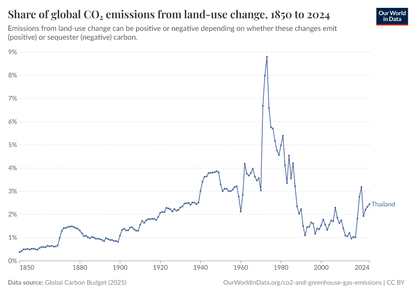 Global Carbon Budget (2025) – with major processing by Our World in Data. “Share of global CO₂ emissions from land-use change” [dataset]. Global Carbon Project, “Global Carbon Budget v15” [original data]. Retrieved December 5, 2025 from https://archive.ourworldindata.org/20251204-133459/grapher/co2-land-use-global-share.html (archived on December 4, 2025).