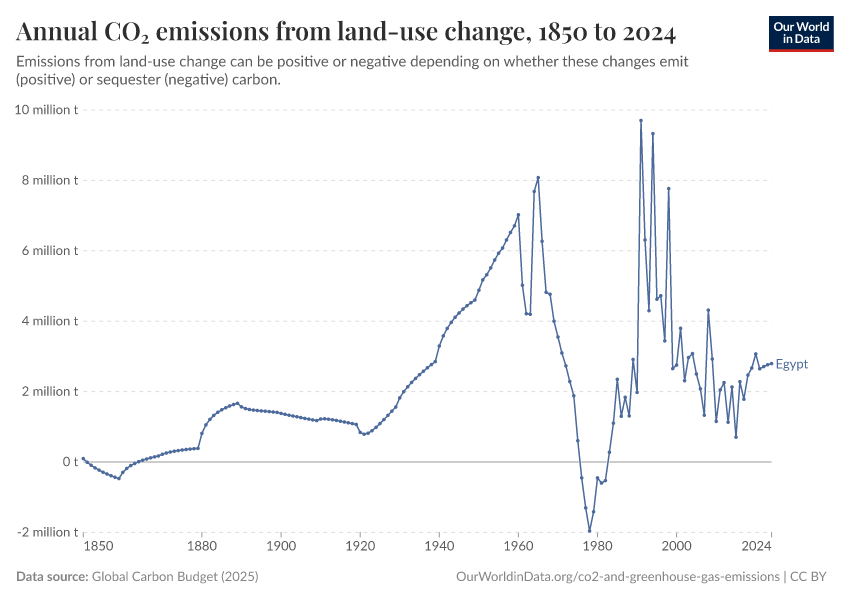 Global Carbon Budget (2025) – with major processing by Our World in Data. “Annual CO₂ emissions from land-use change” [dataset]. Global Carbon Project, “Global Carbon Budget v15” [original data]. Retrieved December 6, 2025 from https://archive.ourworldindata.org/20251204-133459/grapher/co2-land-use.html (archived on December 4, 2025).