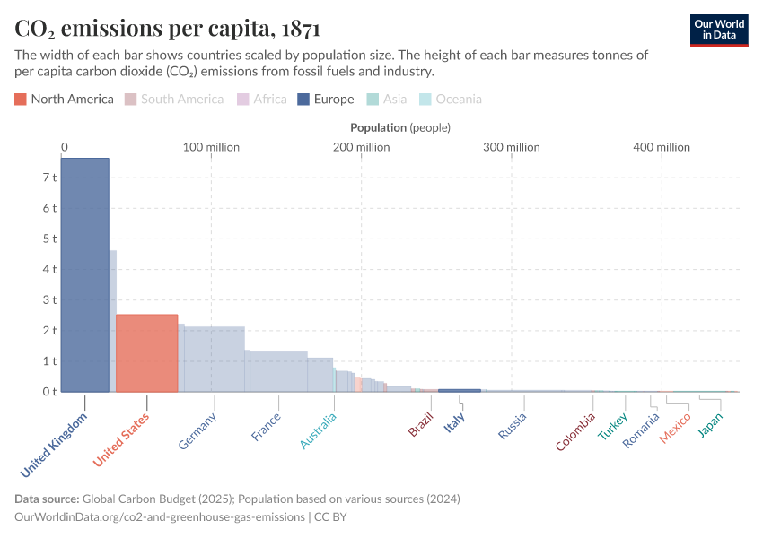 “Data Page: CO₂ emissions per capita”, part of the following publication: Hannah Ritchie, Pablo Rosado, and Max Roser (2023) - “CO₂ and Greenhouse Gas Emissions”. Data adapted from Global Carbon Project, Various sources. Retrieved from https://archive.ourworldindata.org/20251209-133038/grapher/co2-per-capita-marimekko.html [online resource] (archived on December 9, 2025).How to cite this data