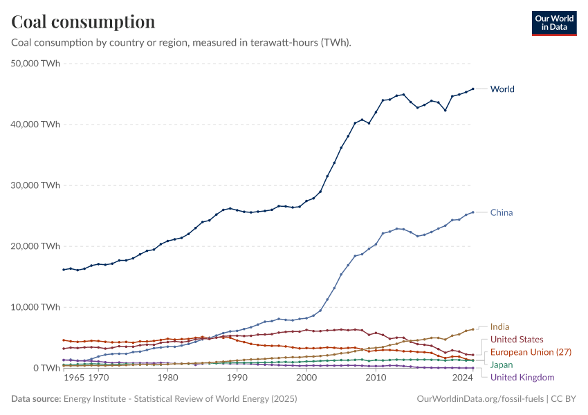 Energy Institute - Statistical Review of World Energy (2025) – with major processing by Our World in Data. “Coal consumption” [dataset]. Energy Institute, “Statistical Review of World Energy” [original data]. Retrieved December 6, 2025 from https://archive.ourworldindata.org/20250909-093708/grapher/coal-consumption-by-country-terawatt-hours-twh.html (archived on September 9, 2025).